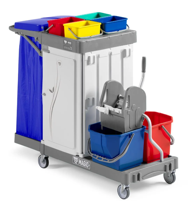Trolley with 3 areas: 120 L foldable bag holder, closed storage area with drawer and washing area with wringer and 2 buckets.
